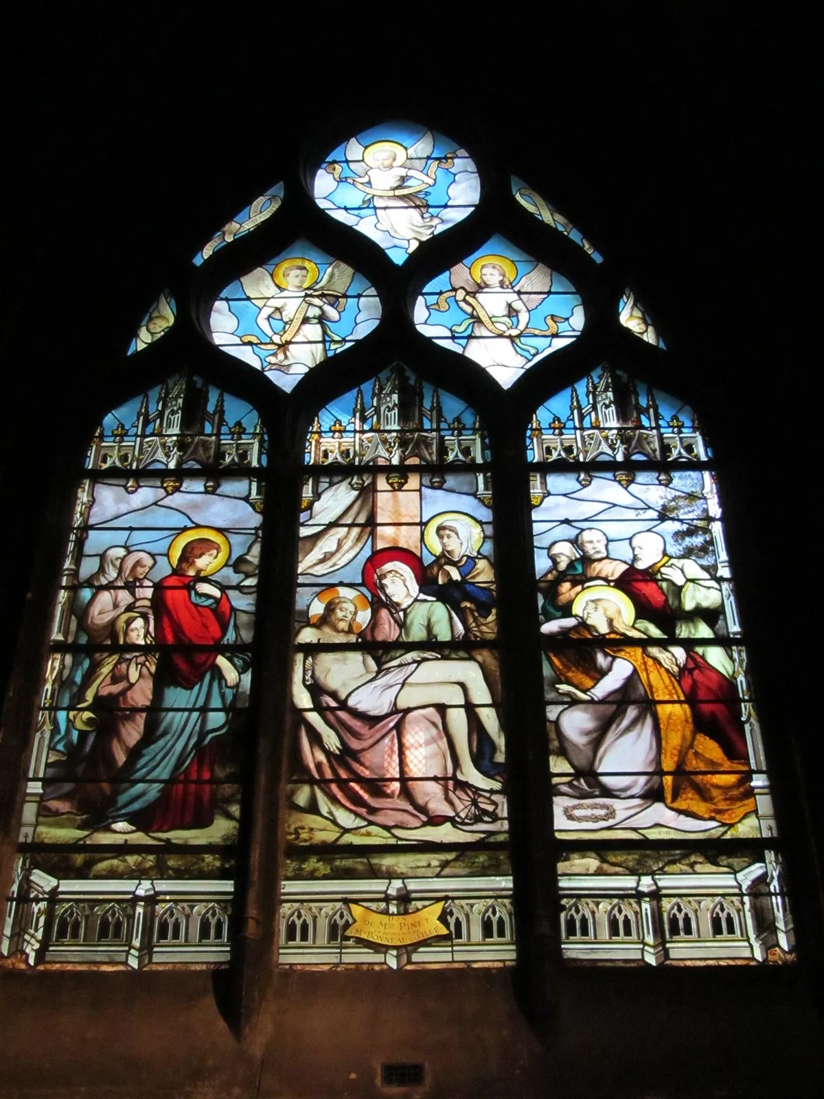 The interior of the church has five naves divided by pillars, a transept, and a deep choir surrounded by an ambulatory. Some stained glass windows date back to the 15th and 16th centuries. The church houses numerous works of art: carved furniture from 1684 by François Mercier; 18th-century choir grille; a 16th-century wooden altarpiece sculpted and gilded with the Life of the Virgin; and a 15th-century Flemish wooden reredos sculpted with Scenes from the Life of Christ. In the chapel on the right side, there is a 13th-century statue of Saint Germain of Auxerre.